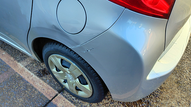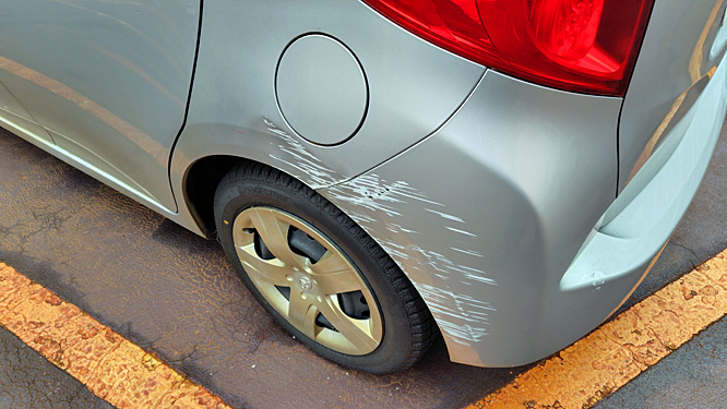 昨日、会社の車を駐車場から出すときに、不注意により後部を壁で擦った。