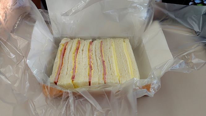 中身は実にシンプルな、ハムサンドとチーズサンド。駅弁のサンドウイッチとしては日本最古らしいのだが、こういうのでいいんだよ! サンドウイッチに緑の侵略者など不要! そして、ハムが美味い! ハムを美味いと感じたのなんて、人生初じゃないか(言い過ぎ)。パッケージによれば、鎌倉ハムのボンレスハムを使用しているとのこと。